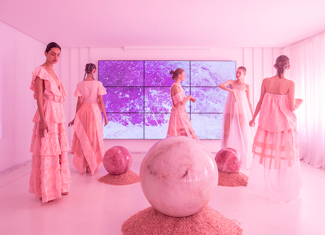 Matéria idealizada por Paula Raia e Vogue Brasil retratando o veio da coleção Verão 2018: Paula Raia juntou-se a outras nove mulheres em uma experiência de autoconhecimento e sororidade para as fotos do Verão 18, que foram tiradas durante rituais que enalteciam o sagrado feminino. Tons róseos evocam quietude e tranquilidade através de algodões “gradeados” e trabalhos artesanais brasileiros, assim como nos relevos dos contornos gráficos de bordados vítreos e acabamentos em conchas trançadas. Fotografada por Rafael Pavarotti