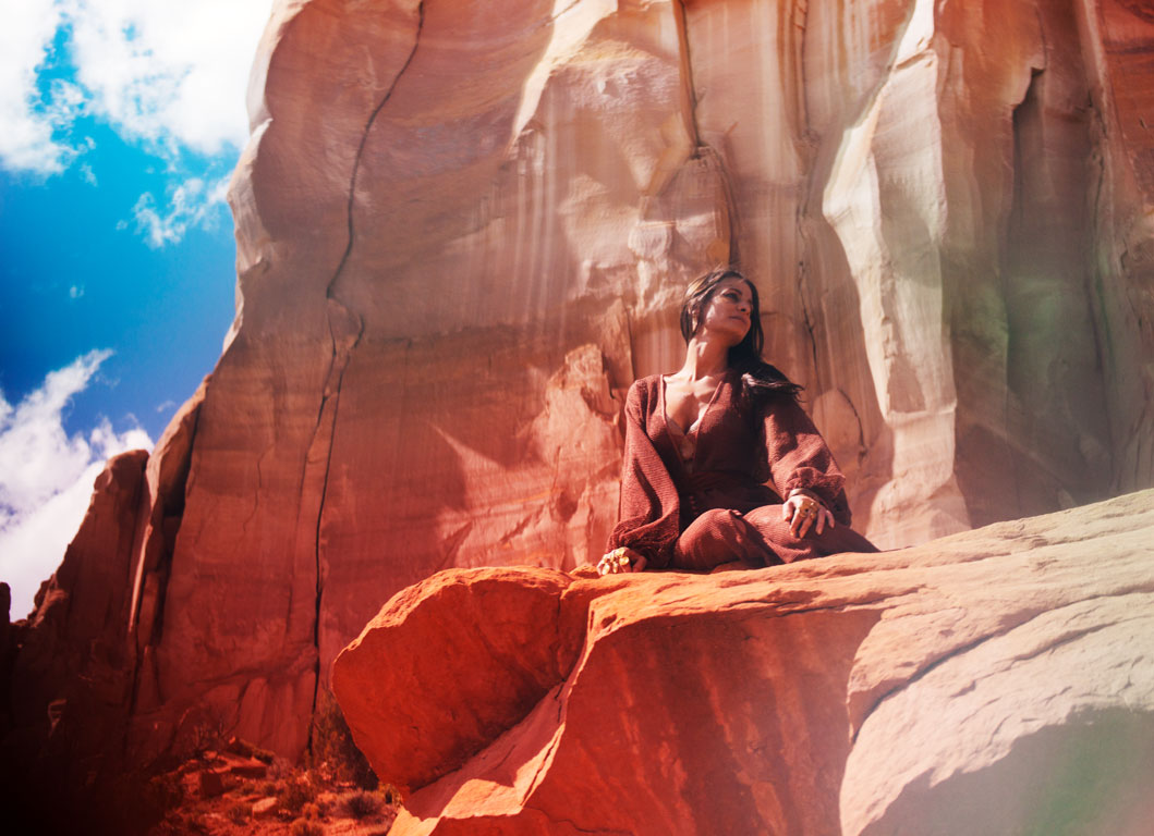 Harmonia, paz, vastidão e uma mulher com um imenso mar interior. Tons de cru representando o